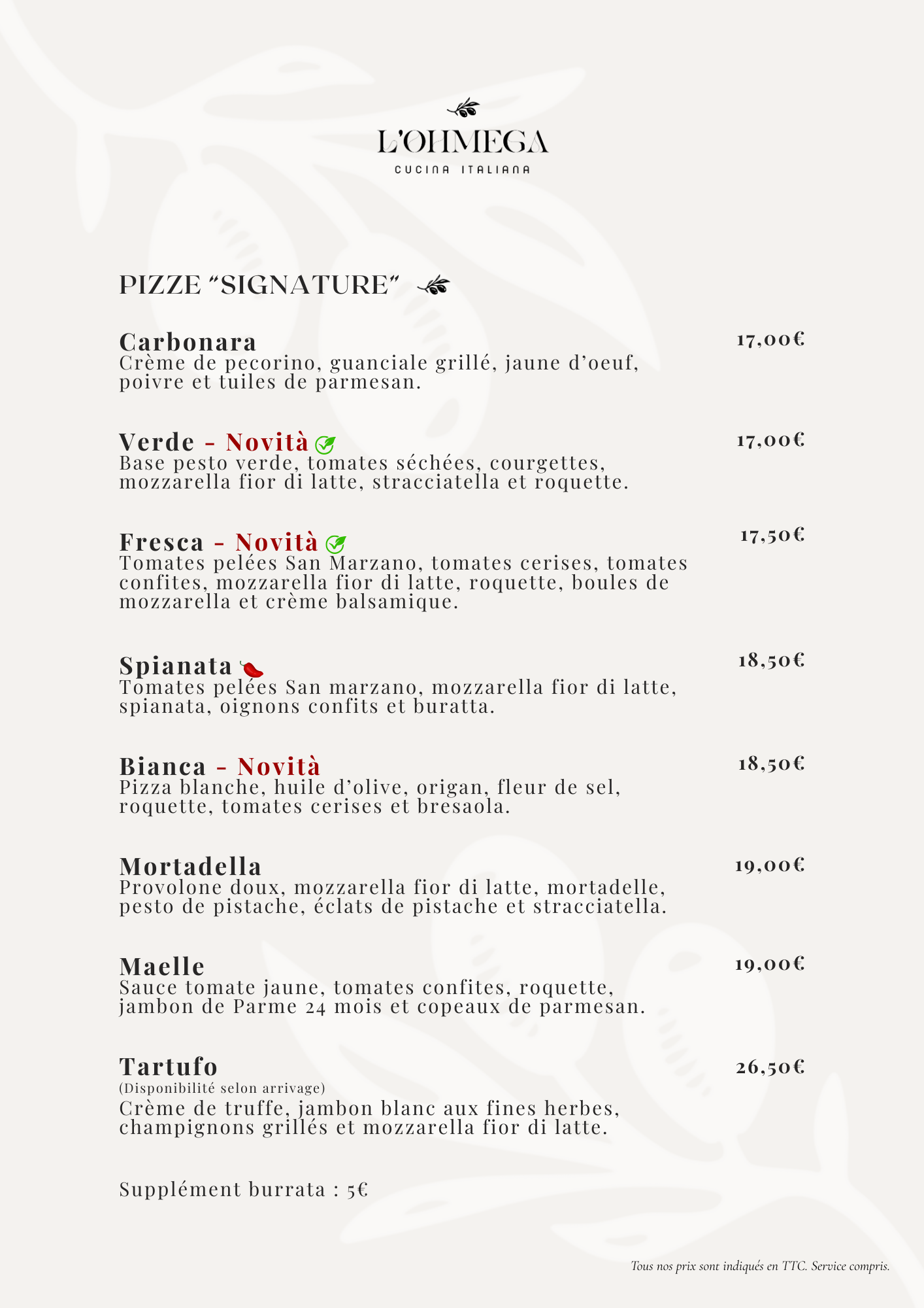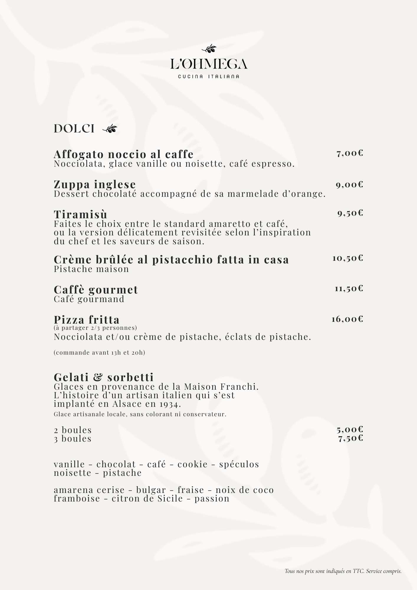 Animée par la passion de la gastronomie et du partage, notre équipe prépare chaque plat avec attention afin de révéler toute la richesse des saveurs. Chez L’Ohmega, chaque moment à table est pensé pour être simple, généreux et authentiquement italien.
