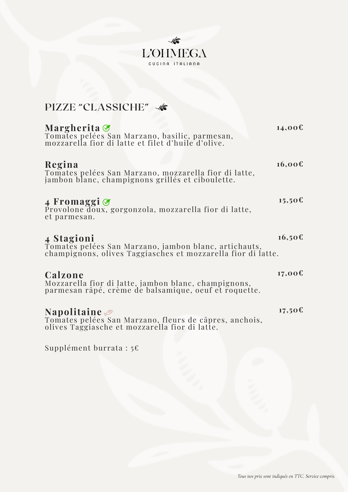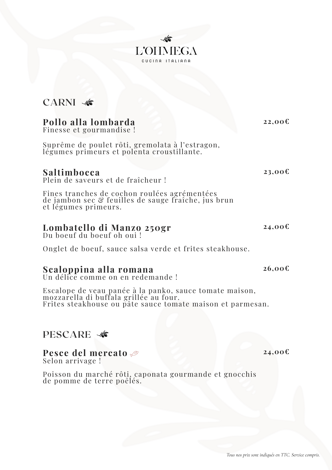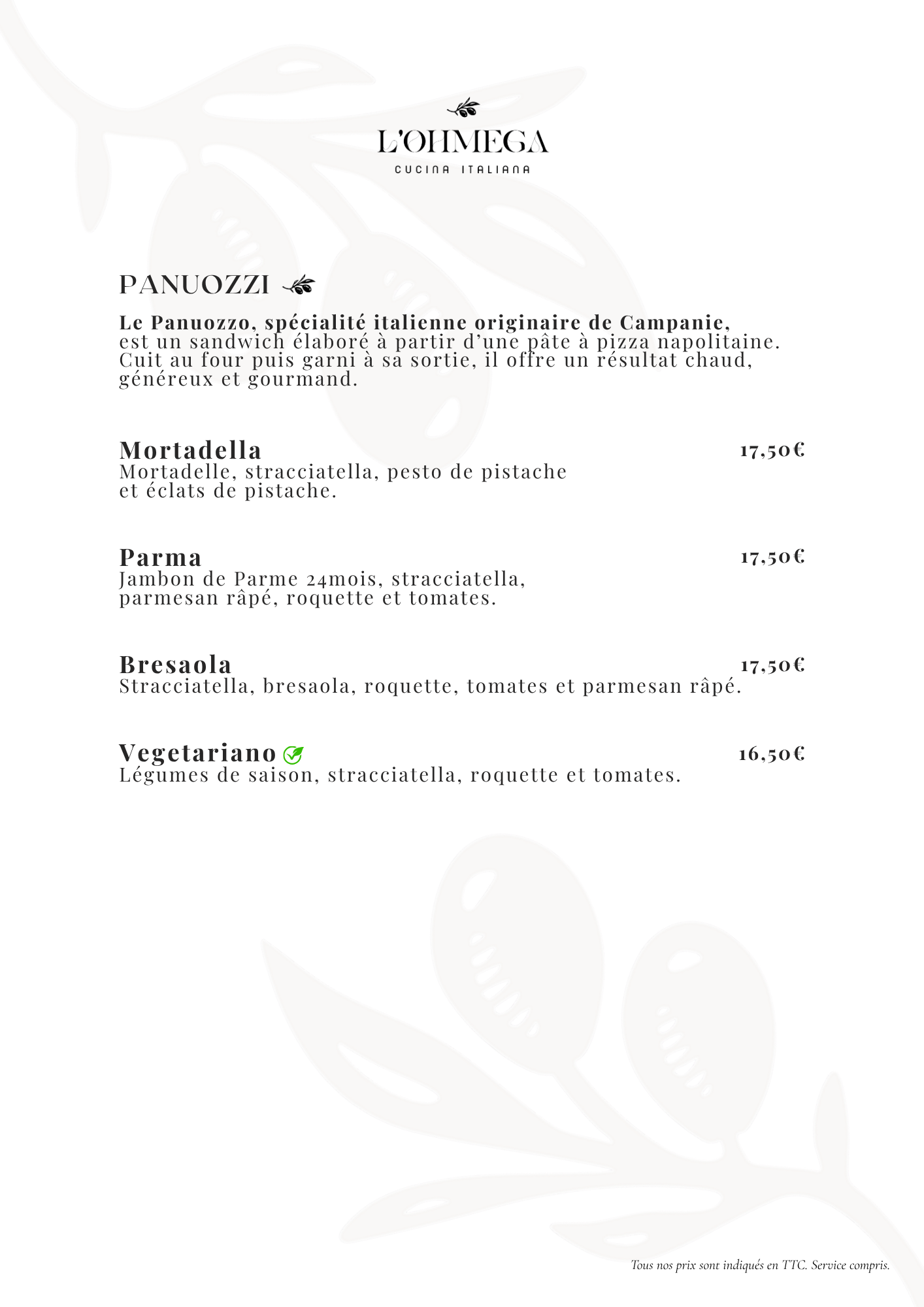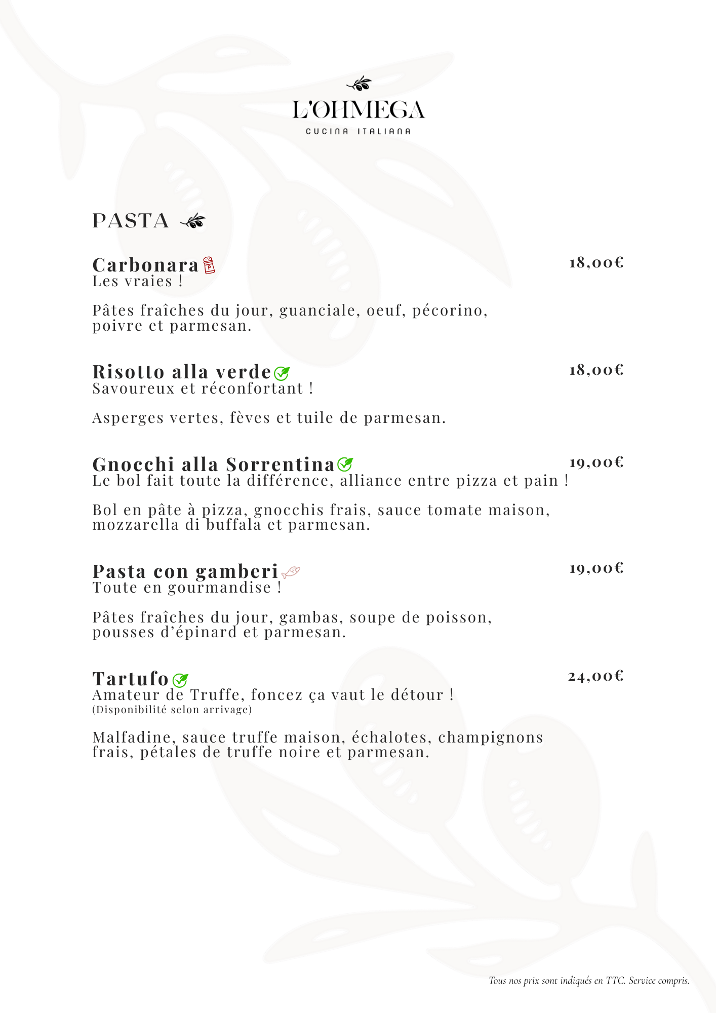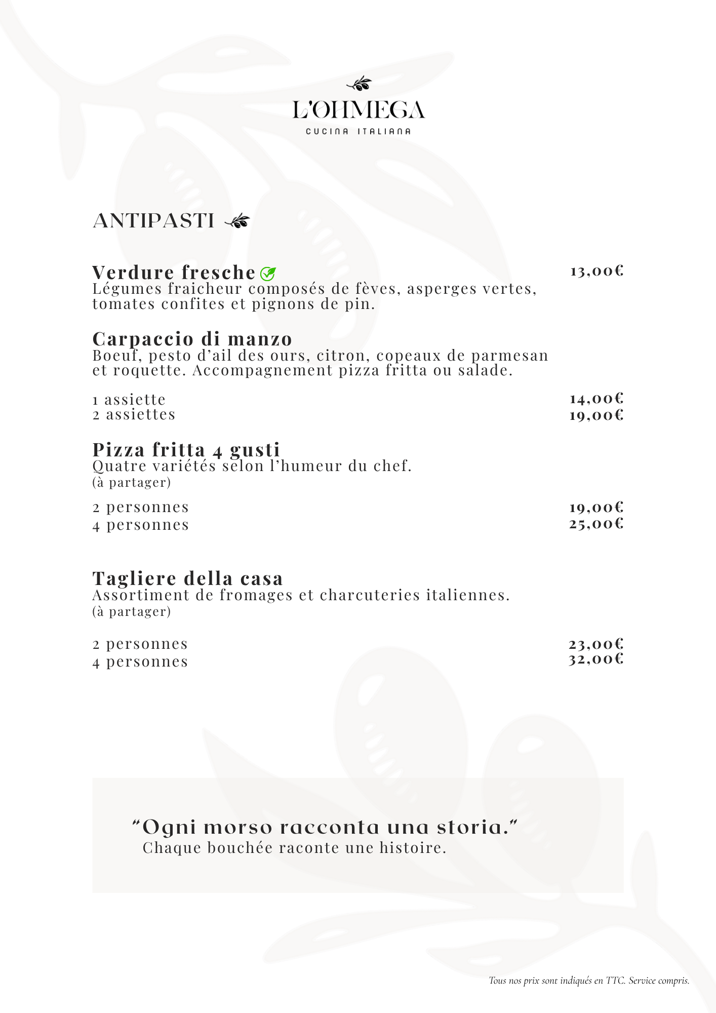 Chez L’Ohmega, nous mettons à l’honneur les véritables saveurs d’Italie à travers des produits soigneusement sélectionnés, inspirés des terroirs italiens. Animée par la tradition et la passion de la cuisine maison, notre équipe prépare chaque plat dans le respect des recettes italiennes authentiques